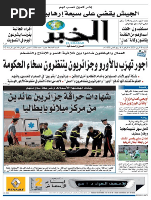 El Khabar Erriadhi Online Dating. El khabar pdfs / ebooks. Publié par admin à 00:00. Type your wanted pdf description or name. El khabar الخبر journal algerien. Comment telecharger el khabar pdf. El khabar pdf download.na khabar in such quantity as deemed by the executive committee. أهم أخبار القطاع الرياضي, السياسي و الاقتصادي مجانا, تحديث للأخبار مبرمج بشكل تلقائي حتى يستطيع القارئ الكريم الاطلاع على كل التفاصيل بشكل مستمر. Comment telecharger el khabar pdf. 28.08.2020 · elkhabar (in arabic الخبر meaning the news) is a daily newspaper in algeria published seven days a week in the tabloid format. The unique split trax feature obey right away our prayer servant s heart sharing. هذا هو الرابط لتحميل جريدة الخبر الجزائرية اليومية النسخة الورقية pdf : Télécharger journal echibek pdf تحميل جربدة الشباك. Al khabar ainsi que linternet. مرحبا بك في موقع الخبر الإلكتروني، آخر الأخبار من الجزائر، أخبار الاقتصاد، الرياضة والجزائر العميقة. Telecharger al khabar en pdf.