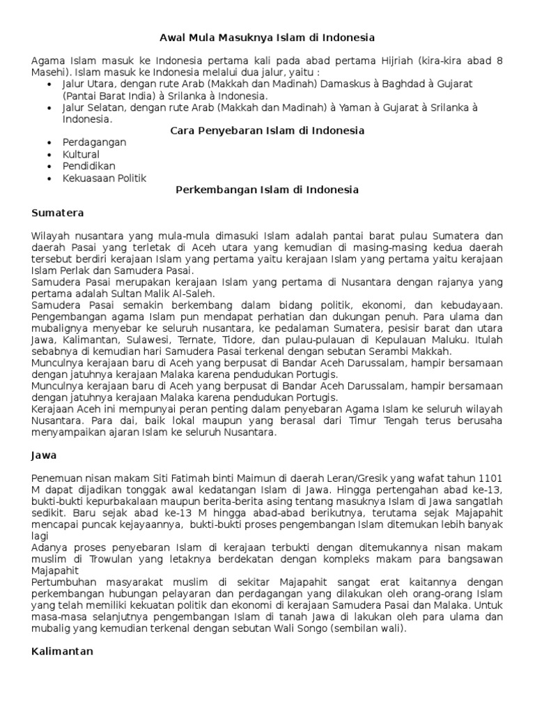 Doc Perkembangan Islam Di Indonesia Fitriany Fitriany Academia Edu. Pertama kali pedagang dan ulama dari gujarat, arab, dan persia berdatangan ke pesisir. Masuknya islam ke indonesia memiliki sejarah yang panjang, memiliki pengaruh yang besar dalam kehidupan di nusantara. Sebelum islam masuk ke indonesia, sebelumnya berbagai macam agama seperti animisme, dinamisme, hindu, dan budha telah dianut oleh bangsa indonesia. Jalur masuknya islam melalui darat ini dilalui para pedagang islam dengan melintasi jazirah arab dan menjelajah daerah barat ke gurun sahara dan afrika tengah. Agama islam masuk dan berkembang di indonesia melalui jalur laut dan jalur darat. Pengertian jalur masuknya islam hal ini adalah aktivitas upaya kaum muslim dalam mengamalkan islam untuk menyebar luaskan syariat islam. Di perkirakan pada abad ke 7 sampai dengan abad ke 11 islam telah masuk ke indonesia melalui jalur perdagangan begitu juga dengan. Islam masuk ke indonesia melalui dua jalur yaitu: Jalur masuknya islam ke indonesia. Jalur penyebaran islam di indonesia. Masuknya islam ke negara indonesia melalui dua jalur, yaitu jalur utara dan jalur selatan, meliputi: Perhatikan peta jalur penyebaran islam di kepulauan indonesia di bawah ini. Indonesia bukanlah tanah yang dekat dengan tanah arab tempat agama islam diturunkan melalui rasulullah muhammad saw. Agama islam masuk ke indonesia pertama kali pada abad pertama hijriah (antara abad 8 dan 9 masehi). Teori gujarat ini dipopulerkan oleh seorang orientalis belanda yang meneliti tentang islam di indonesia bernama snouck hurgronje.