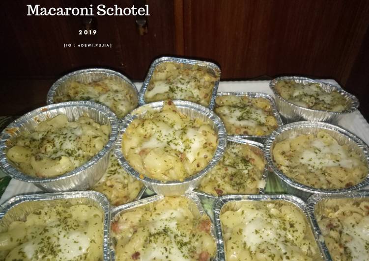 Makaroni schotel or sometimes known as makaroni schaal is an indonesian macaroni casserole dish made up of pasta (macaroni), cheese, milk, butter, meat (smoked beef or chicken are widely used), sausage, tuna, eggs, onion, mushrooms and sometimes potato.